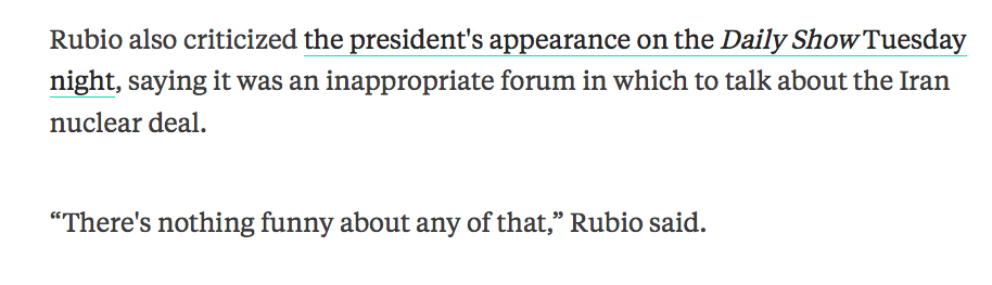 Rubio has been on @thedailyshow at least three times to discuss serious issues. http://bloom.bg/1gOkgBs pic.twitter.com/0esR2WVHKF