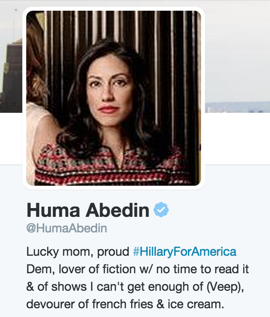 Loves Veep, french fries and ice cream, but no mention of her hubby @anthonyweiner?pic.twitter.com/4yLWXQALQ6