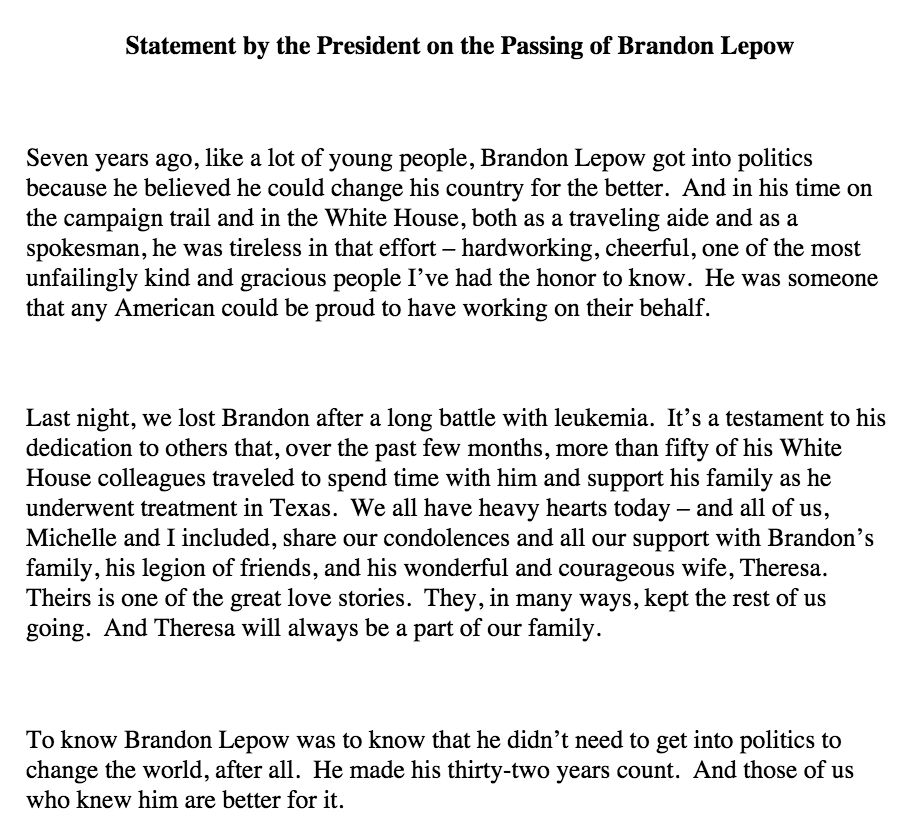Obama statement on the death of young staffer Brandon Lepow after long battle with leukemia ->pic.twitter.com/bimcsiliqf