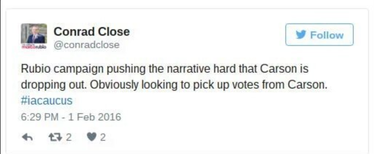 @charliespiering @conradclose @marcorubio Sounds like Close just repeating Rubio's push to say "Carson dropping out." PLZ VET RUBIO ON THIS.