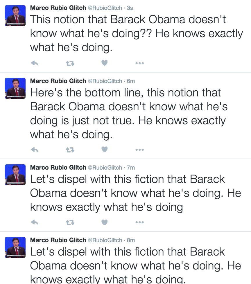 KUDOS! To Marco Rubio for telling it like it is. Barack is fully aware of his actions. No glitch. @charliespiering @RyanMorse33 @marcorubio
