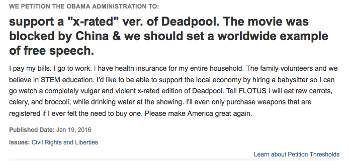 The White House petitions really rarely disappoint. "Support x-rated version of Deadpool." Mmmmkay.pic.twitter.com/rx0T5HuKE1