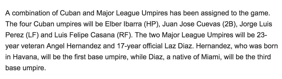 Tomorrow’s baseball game in Cuba - four Cuban umpires - two MLB umpires -> http://m.mlb.com/news/article/168245576/luis-tiant-pedro-lazo-first-pitch-cuba …pic.twitter.com/HvHCISm5Ex