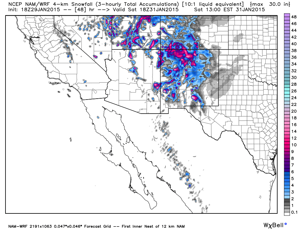 Snowfall totals thru noon Sat. from NAM. Underlines point- warm storm will take elevation to rack up snow. #nmwxpic.twitter.com/gVc5s6ZmcF