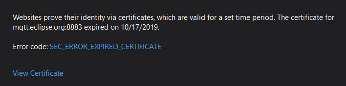 #ssl certificate on secure-mqtt://mqtt.eclipse.org/ expired on 2019-10-17pic.twitter.com/UU7QwTKm3Q