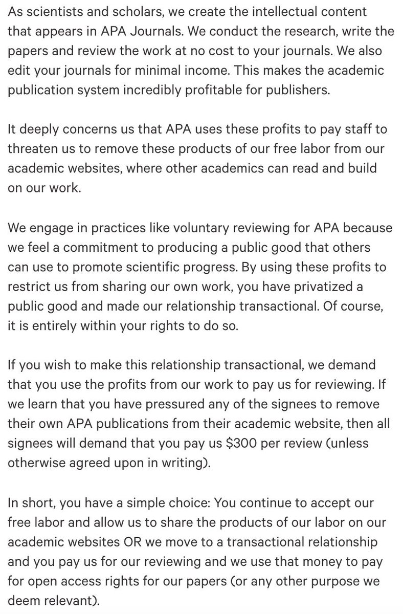 @APA They should stop using the profits of our free labor to pay lawyers who pressure scholars to remove publications from our academic websites. If not, they should use the profits to pay us to review for them. Please sign: https://www.change.org/p/american-psychological-association-right-to-share-publications?recruiter=11934790&utm_source=share_petition&utm_medium=copylink&utm_campaign=share_petition&utm_term=Search%3ESAP%3EUS%3ENonBrand%3EExact …pic.twitter.com/JwFCMqshpG