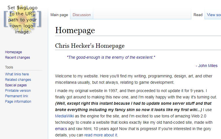 My sleep-deprived prefrontal cortex thought I should make a tiny change on the SpyParty blog right before PAX. 48 hours and a series of farcical decisions later, the blog is unchanged but I had to update php and my personal homepage looks like My First MediaWiki Install.pic.twitter.com/iqiH0rUta8