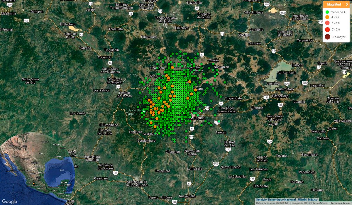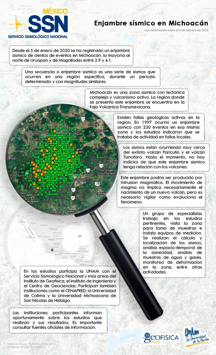 #Uruapan#Michoacán registra 2313#sismos La zona tiene una tectónica compleja y vulcanismo activo, el enjambre podría ser por intrusión magmática, aunque no necesariamente por el nacimiento de un nuevo volcán Vía@SSNMexicopic.twitter.com/vLggDqJ0Br