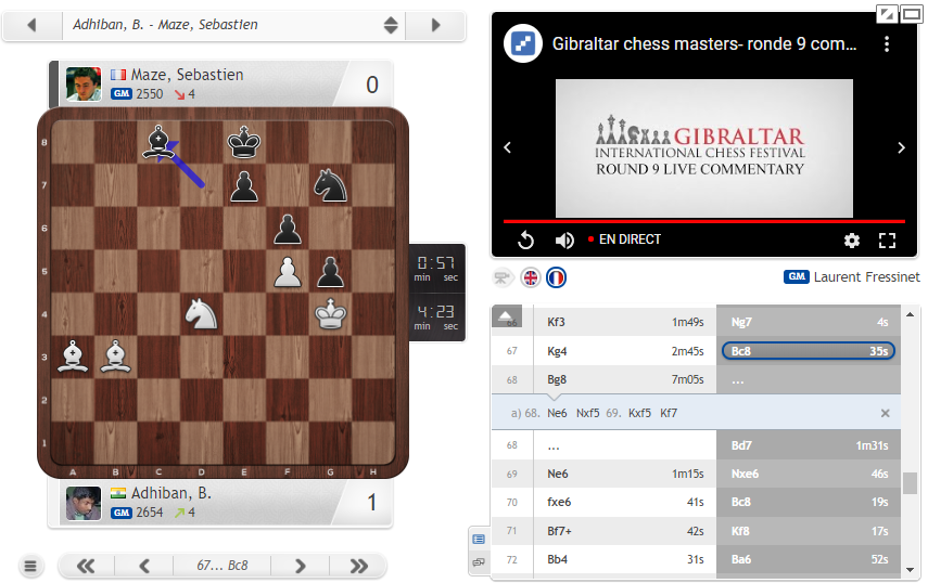 @mazetovic Mal toute la partie, l'élève du GM spécialiste des finales Spiridonov a tendu un beau piège : sur 68.Ce6 Cxf5!! 69.Rxf5 Rf7 fait nulle malgré deux pièces de moins. Mais Adhiban a joué 68.Fg8!! Fd7 et seulement là 69.Ce6! https://chess24.com/fr/watch/live-tournaments/gibraltar-masters-2020/9/1/14 …pic.twitter.com/JSlR7GUKBZ