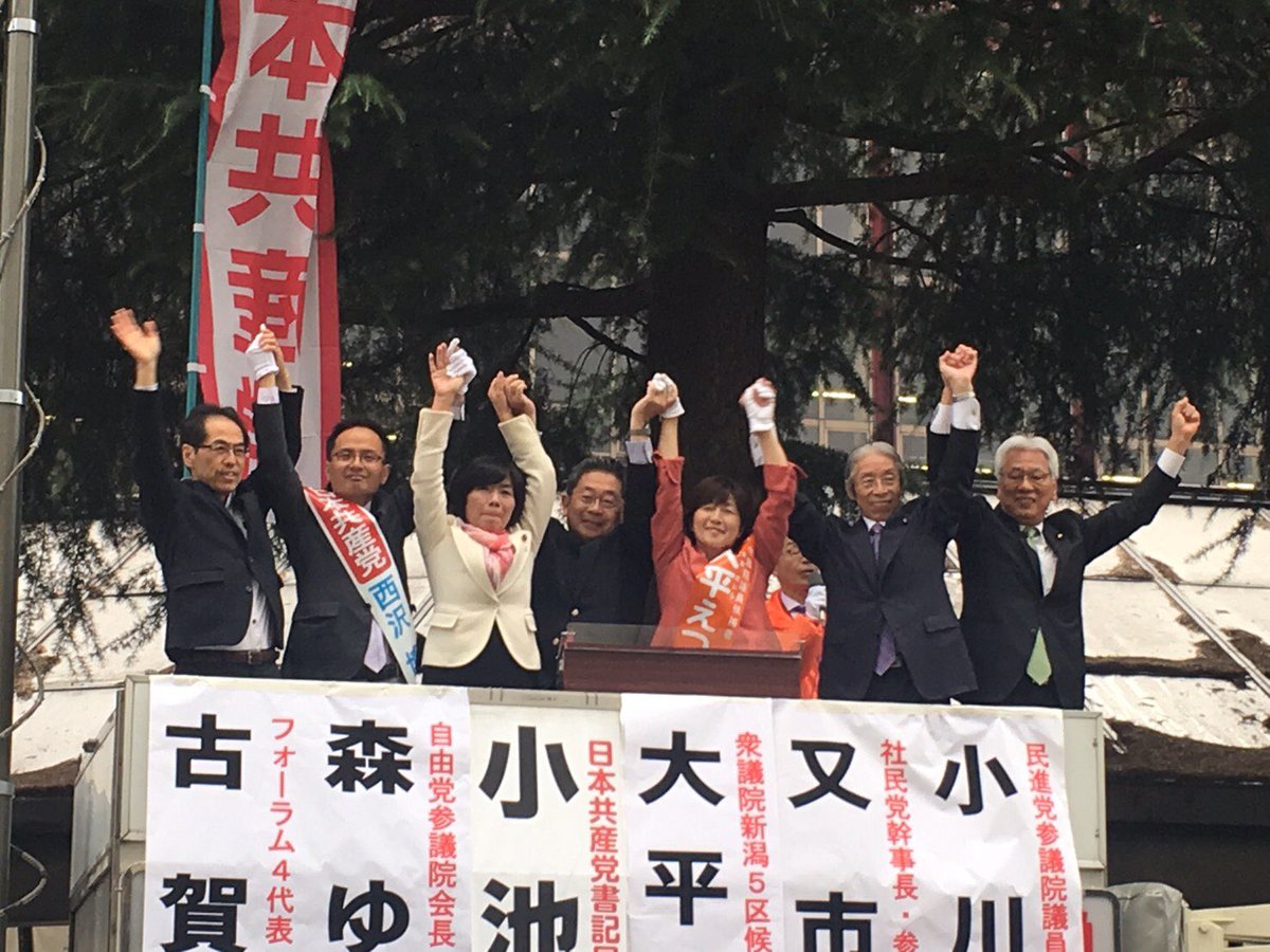 新潟・長岡駅前がすごいことに。市民とオール野党はひとつ!参院選、県知事選以来の流れがまた。 新潟5区大平えつこ候補、比例代表にしざわ博候補と、民進小川敏夫、社民又市征治、自由森ゆうこ、フォーラム4古賀茂明、そして私も。 原発再稼働許さない!必ず勝利を!