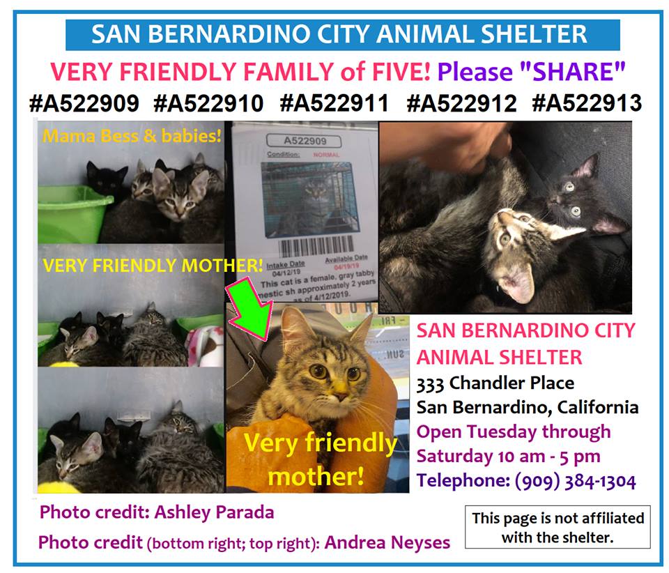 #A522909 & two kittens#A522912#A522913 at the#SanBernardinoCA city shelter need rescue! (Tabby kittens adopted)! The mama & kittens sweet! Email for rescue pack_cr@sbcity.org mccurley_ma@sbcity.org sbrescue@sbcity.org Pledge/share! URGENT! https://www.facebook.com/391166254785216/photos/a.391168011451707/421180615117113/?type=3&theater …pic.twitter.com/Iz3RfLAD4y