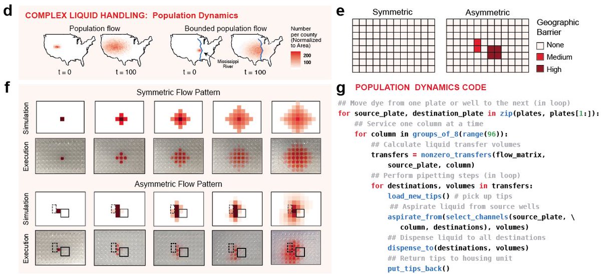 Freed from geometric or line-by-line programming restraints, we can now do all sorts of new experiments like simulating population dynamics. Why specify hundreds of different pipetting steps, when you could just use a matrix to simulate a geographical barrier?.... 5/npic.twitter.com/AOyXoPc2eU