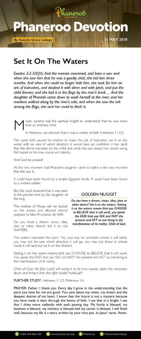Do you have a dream, vision, idea, plan or other desire? Set it on the waters. Setting it on the waters means that you choose to believe that it will work, you speak the end that you see and not the present and act as one living in the manifestation of its reality.