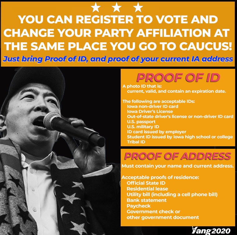 #URGENT: We need everyone to push this tweet out! YOU CAN REGISTER TO VOTE AND CHANGE YOUR PARTY AT THE SAME PLACE YOU GO TO CAUCUS! SPREAD THE WORD#YangGang!#YangUnitesAmerica!pic.twitter.com/s9d80rYQdm
