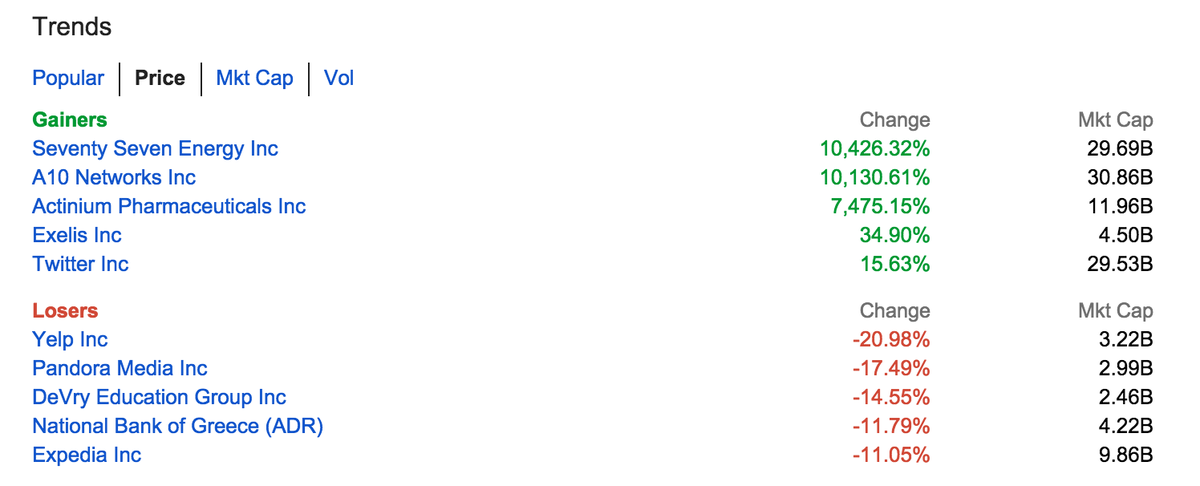 Pretty sure Google Finance just coughed up a hairball. Check out the change in stock price for top three.