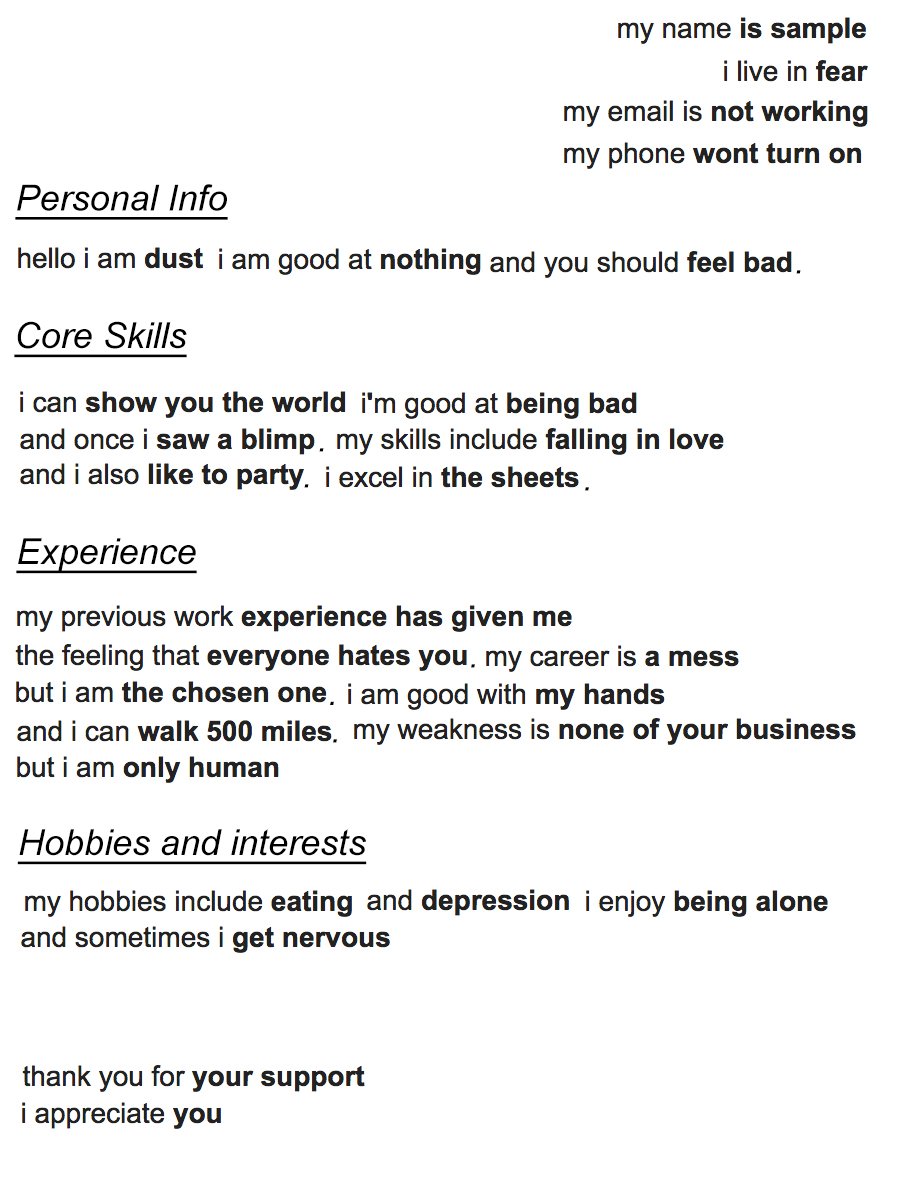 Got made redundant so had to redo my CV and thought fuck it I'm going to do it with google autocomplete again because frankly it's just better.pic.twitter.com/3a1fNXZ25q