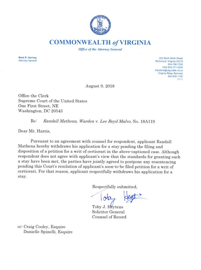 Update: VA AG’s Office & Malvo’s attorneys agreed to postpone any resentencing until after VA’s to-be-filed cert petition (asking #SCOTUS to review the 4th Circuit’s ruling affirming the order that Malvo be resentenced) is resolved, so VA withdrew their stay request.pic.twitter.com/socVKBCuv5