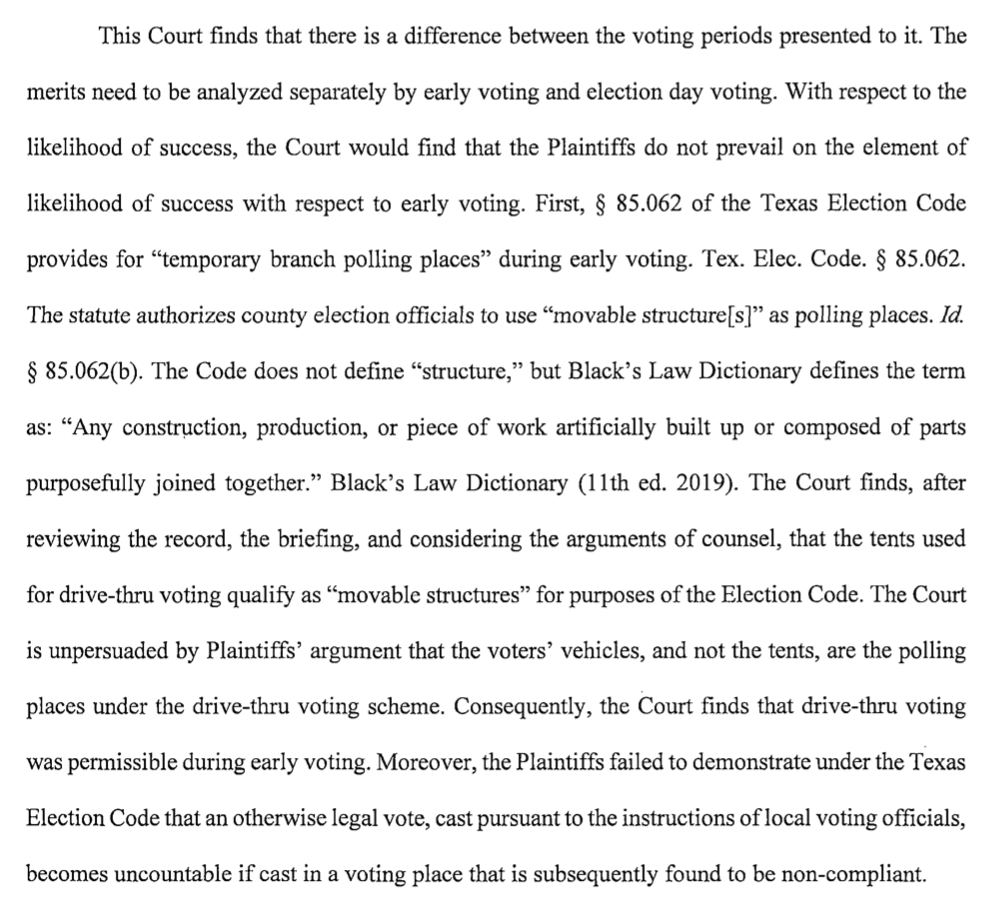 Finally, Hanen — as detailed earlier today — reached a different conclusion as to whether drive-thru voting is allowed under state law on Election Day. He said that, if the plaintiffs had had standing, he would have granted the injunction as to Election Day drive-thru voting.pic.twitter.com/9v7LKtYYWC