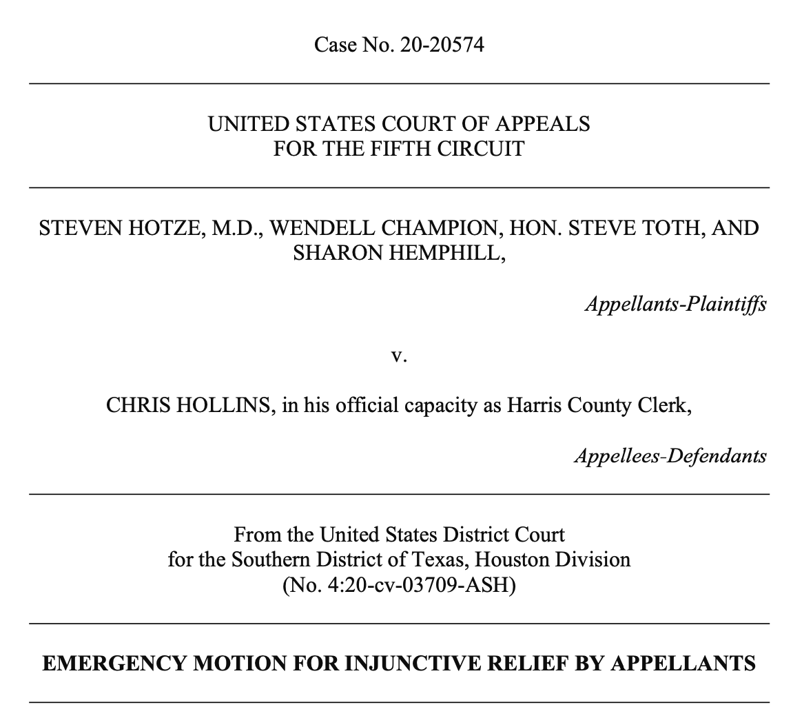 JUST IN: Plaintiffs file their 5th Circuit motion in the Harris County drive-thru voting case, seeking to stop Election Day drive-thru voting. https://www.scribd.com/document/482662878/Hotze-5th-Circuit-Motion …pic.twitter.com/Do15q0qwB6