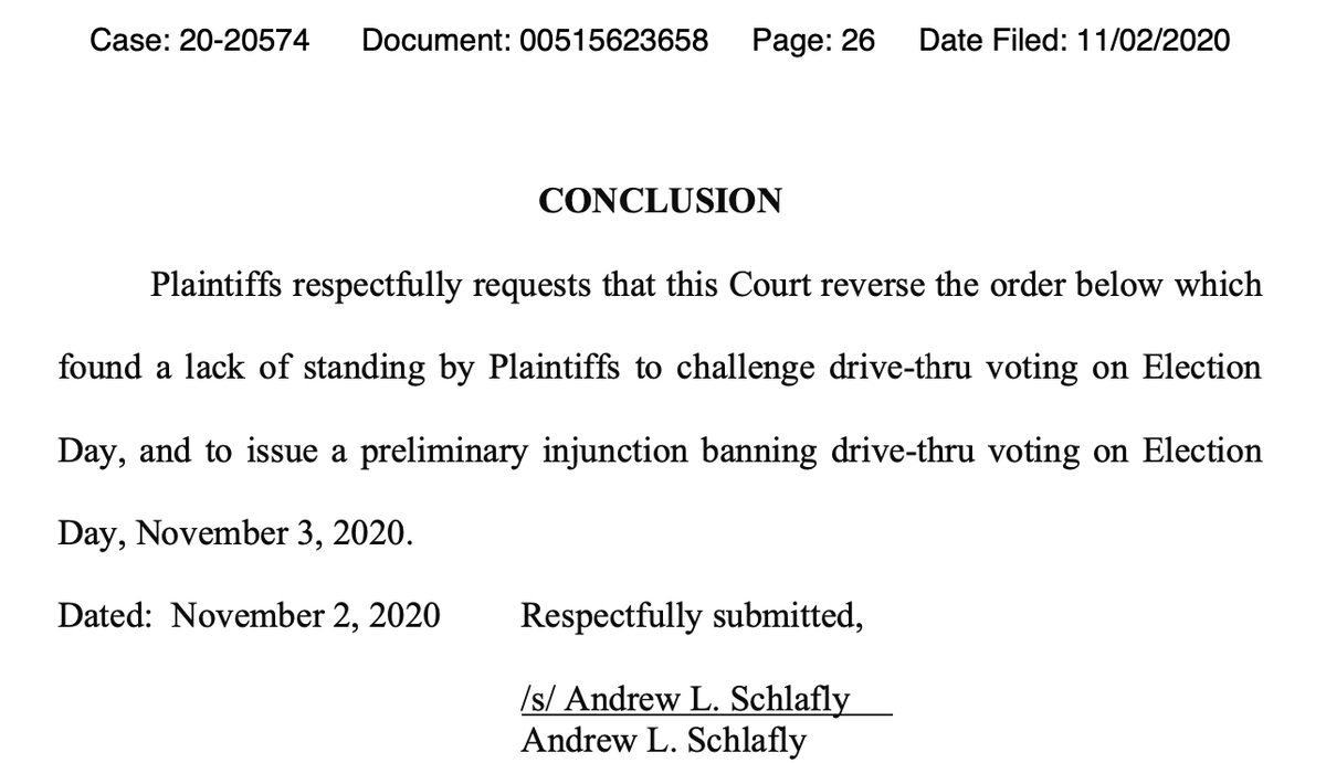 Andrew Schlafly* is counsel of record in the Fifth Circuit appeal for the plaintiffs challenging the Harris County drive-thru voting, per an update to the docket. * = yes, one of Phyllis's sons, and, no, not the gay one