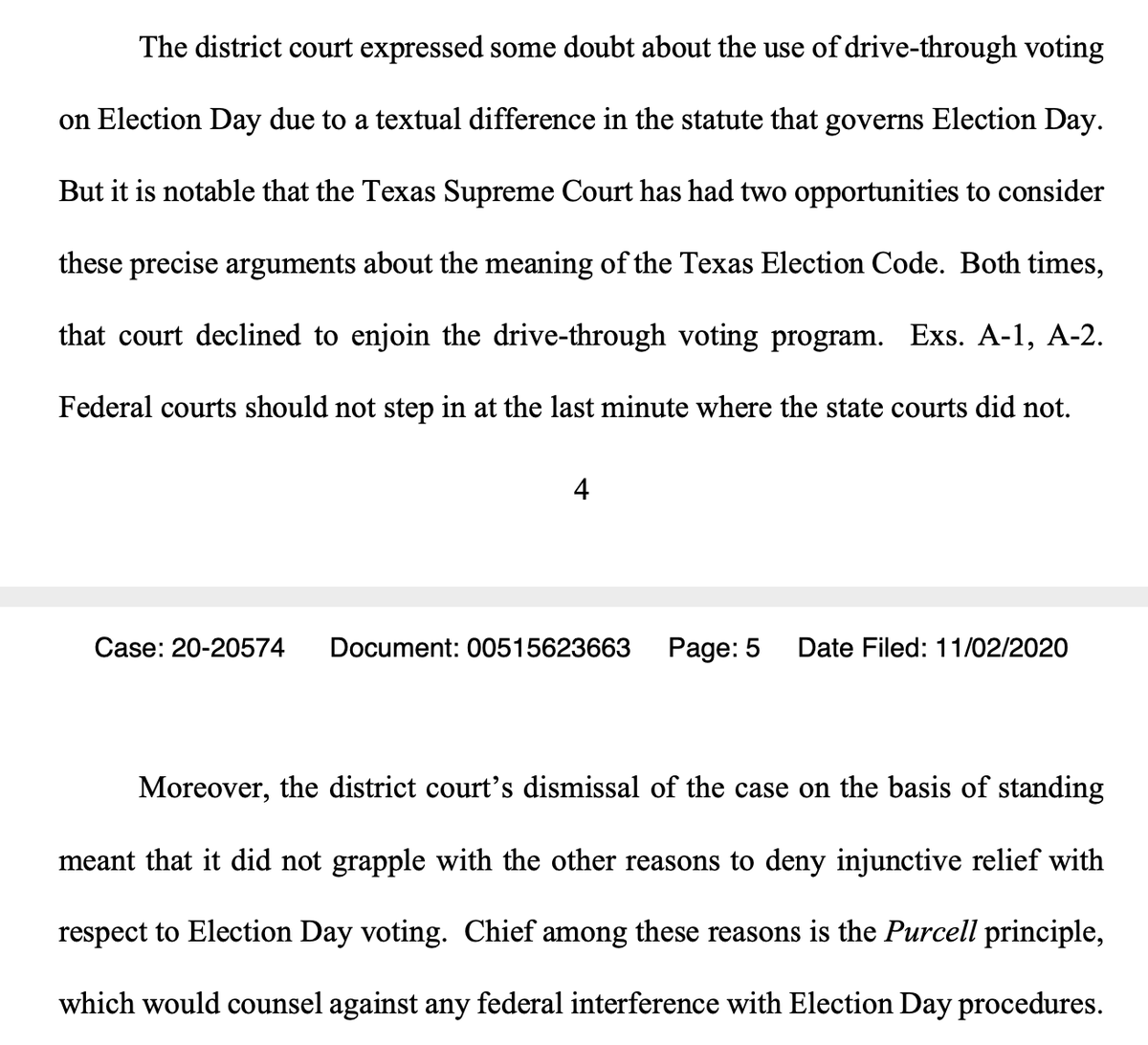 While the plaintiffs go after the drive-thru voting broadly, they're seeking in this emergency motion for the 5th Circuit to hold that they have standing, rule against drive-thru voting on Election Day (quoting Hanen), and order a stop to drive-thru voting tomorrow.pic.twitter.com/7WktxQscJf