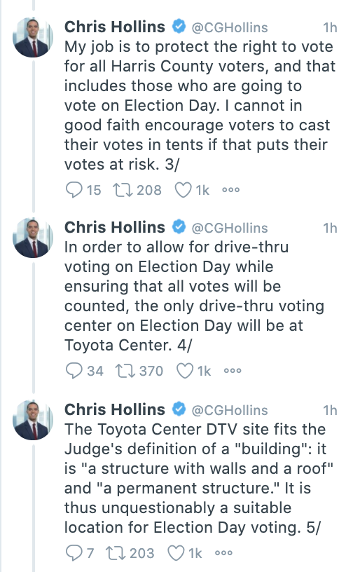 And, very quickly, the 5th Circuit DENIES the plaintiffs' request to ban drive-thru voting in Harris County on Election Day.pic.twitter.com/fA73jBnduT