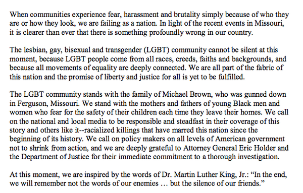 “@chrisgeidner: 58 LGBT groups sign letter "stand[ing] with the family of Michael Brown." http://bit.ly/1oWl6wV pic.twitter.com/rrlqchM36p”