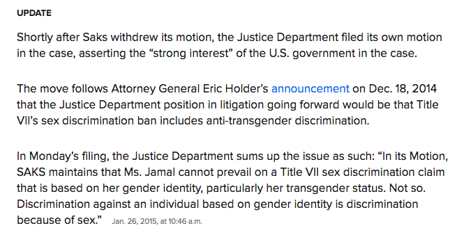 DOJ's filing is a big one for #trans people, and a big slap-down of @Saks. http://bzfd.it/1Cs9zLx pic.twitter.com/dcvSPq4AIr