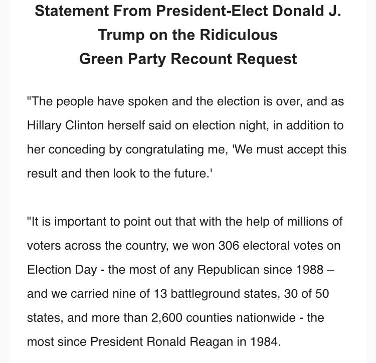 Trump statement on "the Ridiculous Green Party Recount Request" —>pic.twitter.com/uwZkv7Z56p