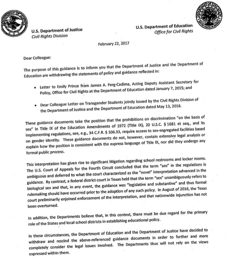 BREAKING: DOJ/Education withdraw guidance on transgender students' rights "in order to further and more completely consider" the issues.pic.twitter.com/5nMr6tcAHY