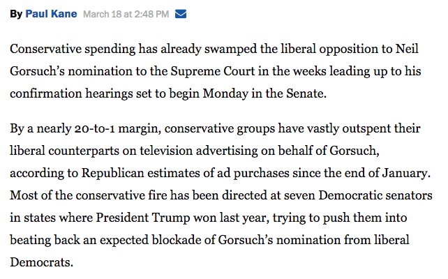 More on how Dems aren't really fighting the Gorsuch #SCOTUS nomination: https://www.washingtonpost.com/politics/senate-democrats-vastly-outspent-by-right-in-gorsuch-fight/2017/03/18/1c42c3e2-0b39-11e7-93dc-00f9bdd74ed1_story.html?utm_term=.a926e16520c7 …pic.twitter.com/qB9xIoyw2c
