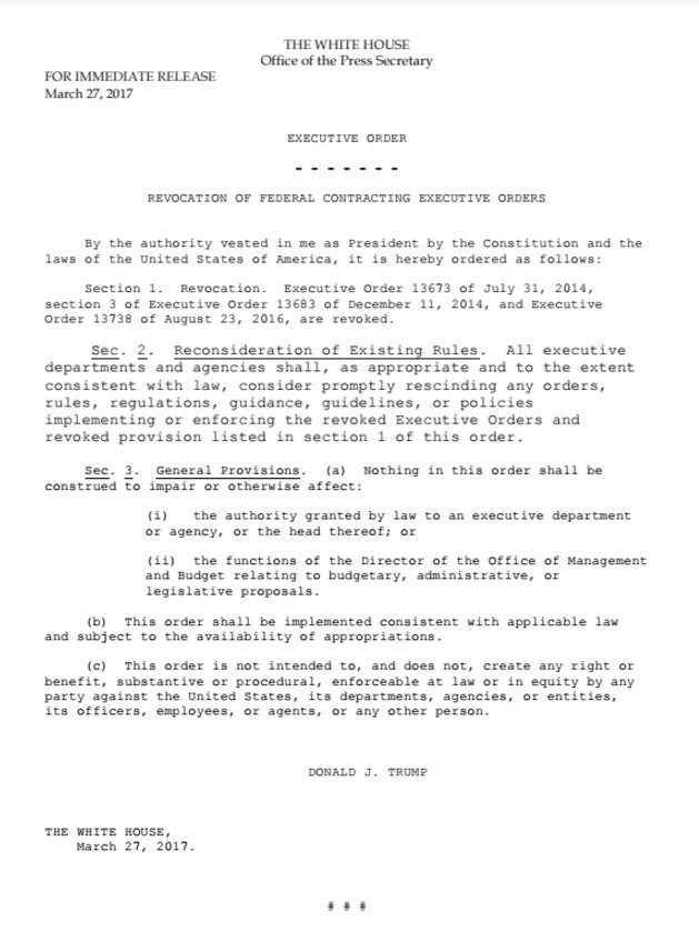 This is getting rid of two Obama EOs: https://obamawhitehouse.archives.gov/the-press-office/2014/07/31/executive-order-fair-pay-and-safe-workplaces … / http://www.presidency.ucsb.edu/ws/?pid=108019
