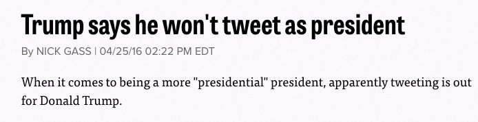 just stumbled across this April 2016 article & if you'll excuse me i'll be laugh/crying @ my desk for next 20 min http://www.politico.com/blogs/2016-gop-primary-live-updates-and-results/2016/04/trump-no-tweeting-president-222408 …pic.twitter.com/TmNrBfvKGo