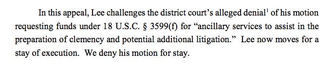 Lee's federal district court 1983 / DNA action and request for a stay of execution is denied. https://www.documentcloud.org/documents/3675137-Lee-v-Jegley-Order.html …pic.twitter.com/bxdynFFlt3