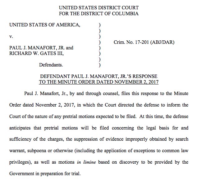 JUST IN: Manafort lawyer says he plans to challenge "evidence improperly obtained by search warrant, subpoena or otherwise."pic.twitter.com/XGHrtCpvI6