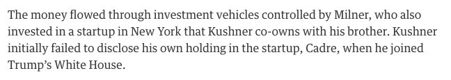 "Kushner initially failed to disclose his own holding in the startup, Cadre, when he joined Trump’s White House."https://www.theguardian.com/news/2017/nov/05/russia-funded-facebook-twitter-investments-kushner-associate …