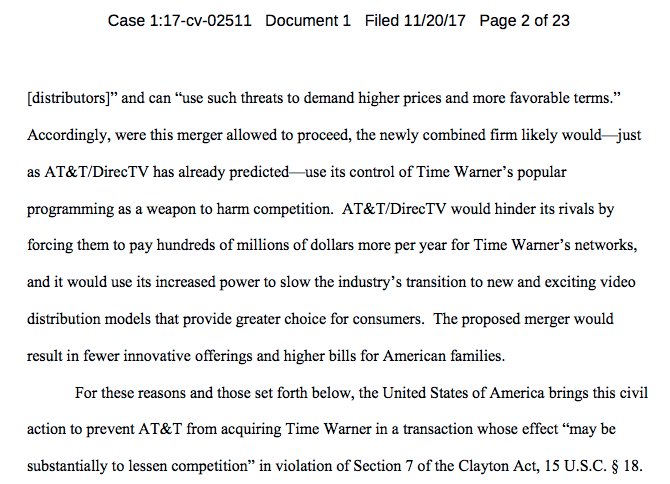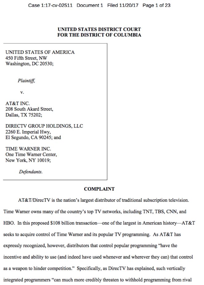 Complaint signed by Makan Delrahim as Assistant AG for Antitrust. That's interesting considering he was quoted as saying, "I don't see this as a major antitrust problem."http://money.cnn.com/2017/11/09/media/antitrust-trump-makan-delrahim/index.html …
