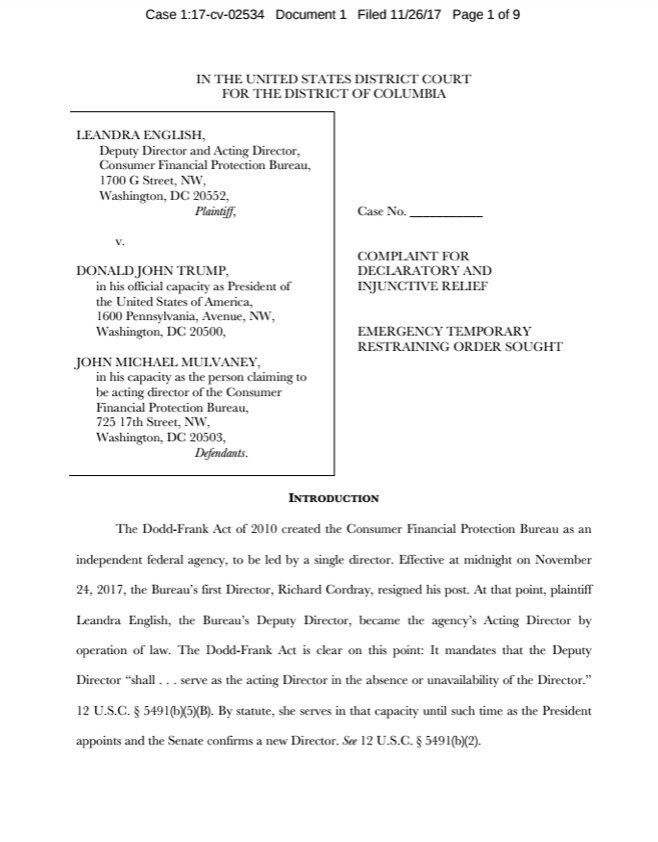If English wins, Trump’s nominee will need to go through the confirmation process, which constrains Trump’s choice of nominee and forces a public debate that CFPB advocates think helps them. If Mulvaney wins, Trump can forever avoid the confirmation process for this position.