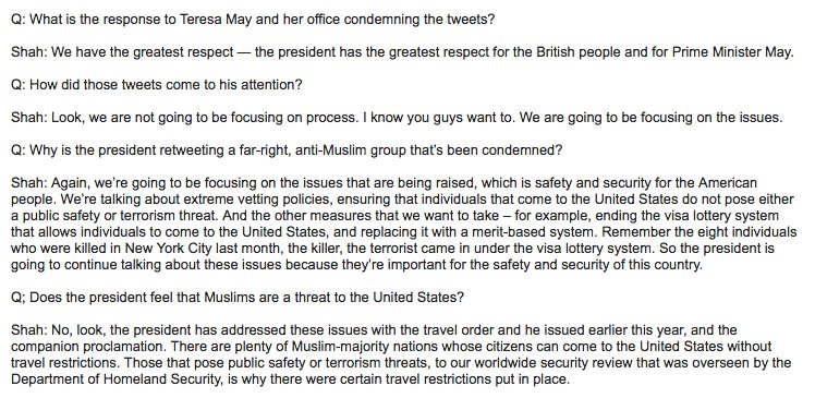 Q: Does Trump’s think Muslims are a threat to the US? "The president has addressed these issues with the travel order,” deputy press sec Raj Shah tells press on AF1.