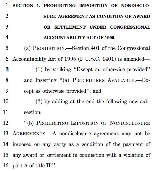 JUST IN: New bill introduced in the House today would amend the Congressional Accountability Act: "A nondisclosure agreement may not be imposed on any party as condition of the payment of any award or settlement in connection with a violation of" the CAA.https://stewart.house.gov/media-center/press-releases/stewart-and-bonamici-introduce-the-victims-voice-and-transparency-act …
