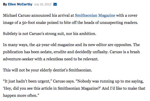 Here's the Post incoming profile story on Caruso back in 2012: https://www.washingtonpost.com/entertainment/museums/michael-caruso-smithsonians-new-editor-sees-a-livelier-future-for-magazine/2012/07/19/gJQAdrPEwW_story.html?utm_term=.113554cc12d3 …pic.twitter.com/eIERFkaIcp