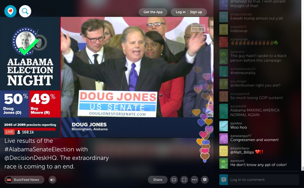 More than 165,000 people watching the @BuzzFeedNews / @DecisionDeskHQ livestream as Doug Jones was declared the projected winner of #ALSen: https://www.pscp.tv/w/1jMJgdPXWbbxL pic.twitter.com/25qrC4yNim