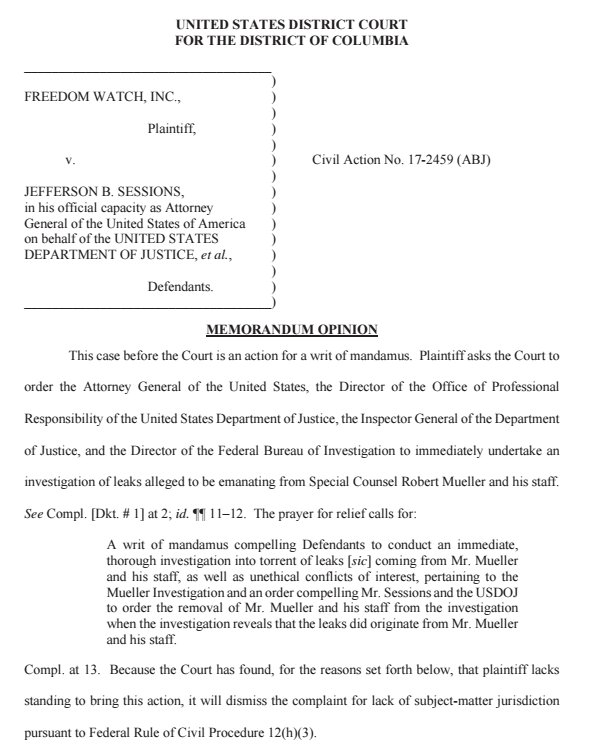 Larry Klayman's Judicial Watch lawsuit seeking a court-ordered leak investigation of the Special Counsel's Office is dismissed : https://www.documentcloud.org/documents/4334309-document-22000529.html …pic.twitter.com/m4FDDcU1e2