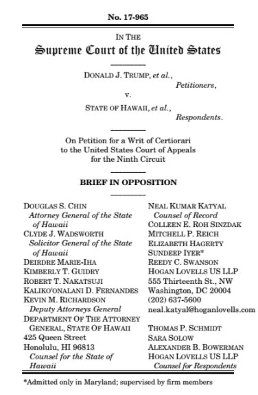 Hawaii responds to DOJ's cert petition in the #travelban 3.0 case: https://www.documentcloud.org/documents/4349484-17-965-Trump-v-Hawaii-Brief-in-Opposition.html … #SCOTUSpic.twitter.com/tUREb97cl3