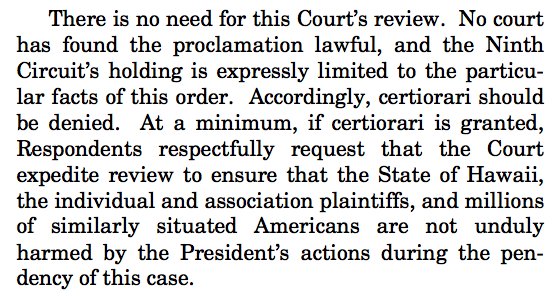 Hawaii's argument: "No court has found the proclamation lawful," so cert should be denied — or, at the least, the case should be heard quickly (since the injunction is stayed until the case is resolved by #SCOTUS).pic.twitter.com/ScoUNX69G8