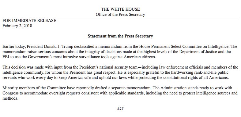 .@PressSec: "The memorandum raises serious concerns about the integrity of decisions made at the highest levels of the Department of Justice and the FBI to use the Government’s most intrusive surveillance tools against American citizens."pic.twitter.com/WzoFWDbVog