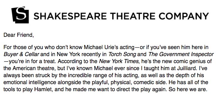I'm so jealous! I've seen @michaelurie in all those NYC plays and one other (the name of which escapes me) at the @LabTheaterNYC a year or so ago. I'll bet he'll be wonderful and you'll have to let us know what you thought!