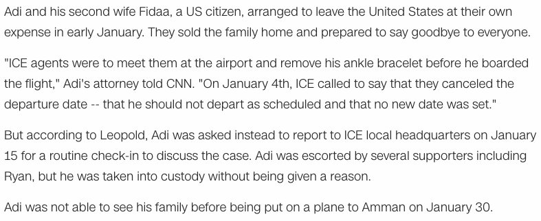 Amer Adi lived in America for nearly 40 years. He has a wife who is a U.S. citizen, and four daughters who are also U.S. citizens. He owns several businesses in his adopted hometown of Youngstown, Ohio. A week ago, he was deported.https://www.cnn.com/2018/02/08/middleeast/deportee-us-intl/index.html …