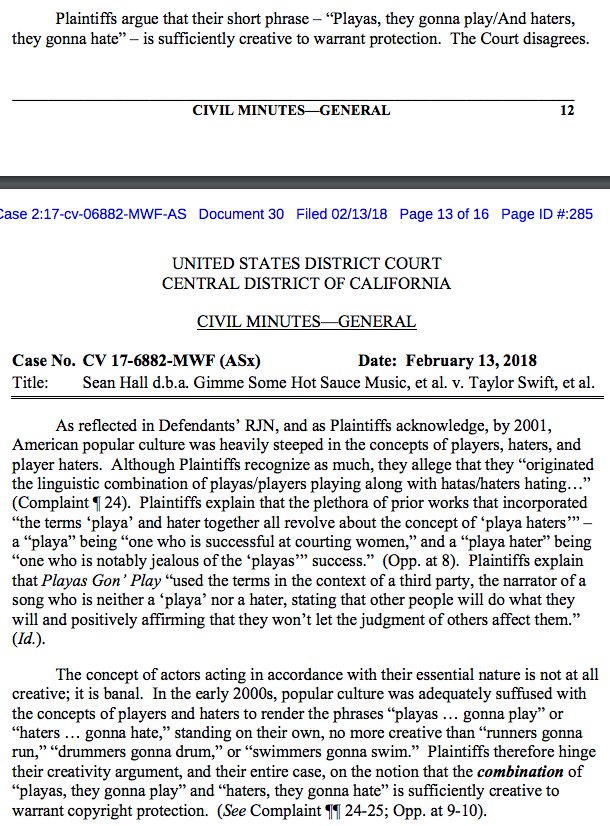 "The concept of actors acting in accordance with their essential nature is not at all creative; it is banal." - US District Judge Michael Fitzgerald, tossing out a "Shake It Off"-related copyright lawsuit against Taylor Swift (h/t @thefader) https://www.documentcloud.org/documents/4378757-Taylor-Swift-ruling-021318.html …pic.twitter.com/GLfcUUZJCv