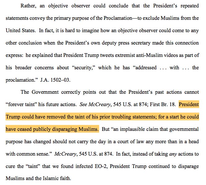 Striking to contrast Trump's comments just now to the 4th Circuit opinion and the court's assessment of Trump's statements and actions.pic.twitter.com/a3e4cNtt0q